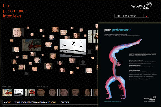![]() Pure Performance Campaign Art Direction Photo Shoot Direction Print Advertising Design Video Production & Editing Web Site Design ValueClick Media trademarked the tagline "The Pure Performance Network". As part of their promotional campaign, they wanted a microsite featuring The Performance Interviews - a series of interviews with the brightest minds in the online advertising industry on what 'performance' means to them, both personally and professionally. A corresponding print campaign featured custom photos of performance artists. Winner of the 2007 "best online campaign" from IAC (Internet Advertising Competition - Web Marketing Association) |