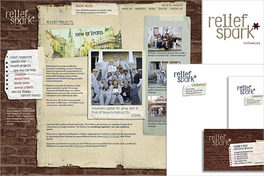 ![]() Relief Spark Logo Design Corporate Identity System Design Web Site Design Relief Spark is a non-profit grassroots organization providing disaster relief and preparedness that formed immediately after Hurricane Katrina. Their passionate relief efforts contine to this day. |